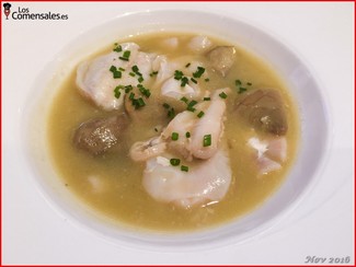 ─ Cocochas de bacalao al pil pil de alcachofa. Extraordinarias. No me cansaría de comer este plato pues realmente en ningún momento eché en falta el aceite de oliva con el que se hace el pil pil tradicional, siendo en este caso mucho más ligero, pero no por ello menos sabroso y más lleno de matices. Fantástico.