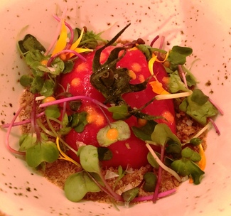 Muy bien también el guiso de rabo de toro con el contraste dulzón del boniato y ese chocolate en polvo que llevaba por encima. Algo seco quedó el pollo, cuya cobertura final, a base de un triturado de una especie de maíz tostado, contribuía en gran medida. No me convenció el trampantojo que simulaba ser tomate resultando pimiento y en cuanto al postre... pues cumplió su función, con una textura e intensidad suaves, aderezado con una salsa de recuerdo especiado, que me descolocó un tanto aunque no le iba mal al conjunto.