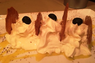 - Tallarines de sepia con guacamole y queso azul: un guiño a la cocina italiana, elaborado con tiras de sepia muy finas y rebozadas en tempura sobre un lecho de guacamole y el queso rayado por encima. Muy buen contraste de sabores y texturas en boca.