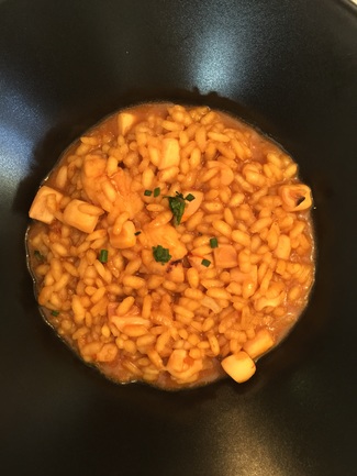 Continuamos con un Lomo desalmonete sin espinas( para mi importante),sobre cama de fideua con salsa de la propia cabeza.