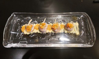 - Panceta, anguila ahumada, frambuesa y tupinanbo: La presumible untuosidad de la panceta que podría acarrear un efecto denso y pesado se neutraliza con el resto de ingredientes: la anguila, levemente cocinada y con un marcado sabor ahumado, la crema del tubérculo y los trocitos de frambuesa que resultan crujientes proporcionando, además, un toque divertido y una mesurada acidez.