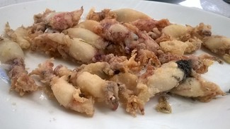 La cocina que aquí se oficia tiene poco misterio aparte de un producto marino de primer nivel y de mucho arte en la fritura, preparación que en Andalucía en general y en Cádiz en particular desde luego que bordan. Comenzamos con una especialidad de la casa, las bocas de la isla, que son pinzas de cangrejo barrilete cocidas, un cangrejo “violinista” endémico de la bahía gaditana con una pinza mucho más grande que la otra. Muy frescas y parecidas a las nécoras. Para comerlos bien nos dan unos curiosos mazos de madera parecidos a los de los jueces, con lo que al final hubo su cachondeo con el aperitivo…