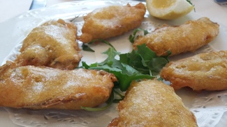 Les espardeñes aquí se les llama al boquerón abierto y desespinado en tempura. Muy buena la tempura. Bocado tierno.