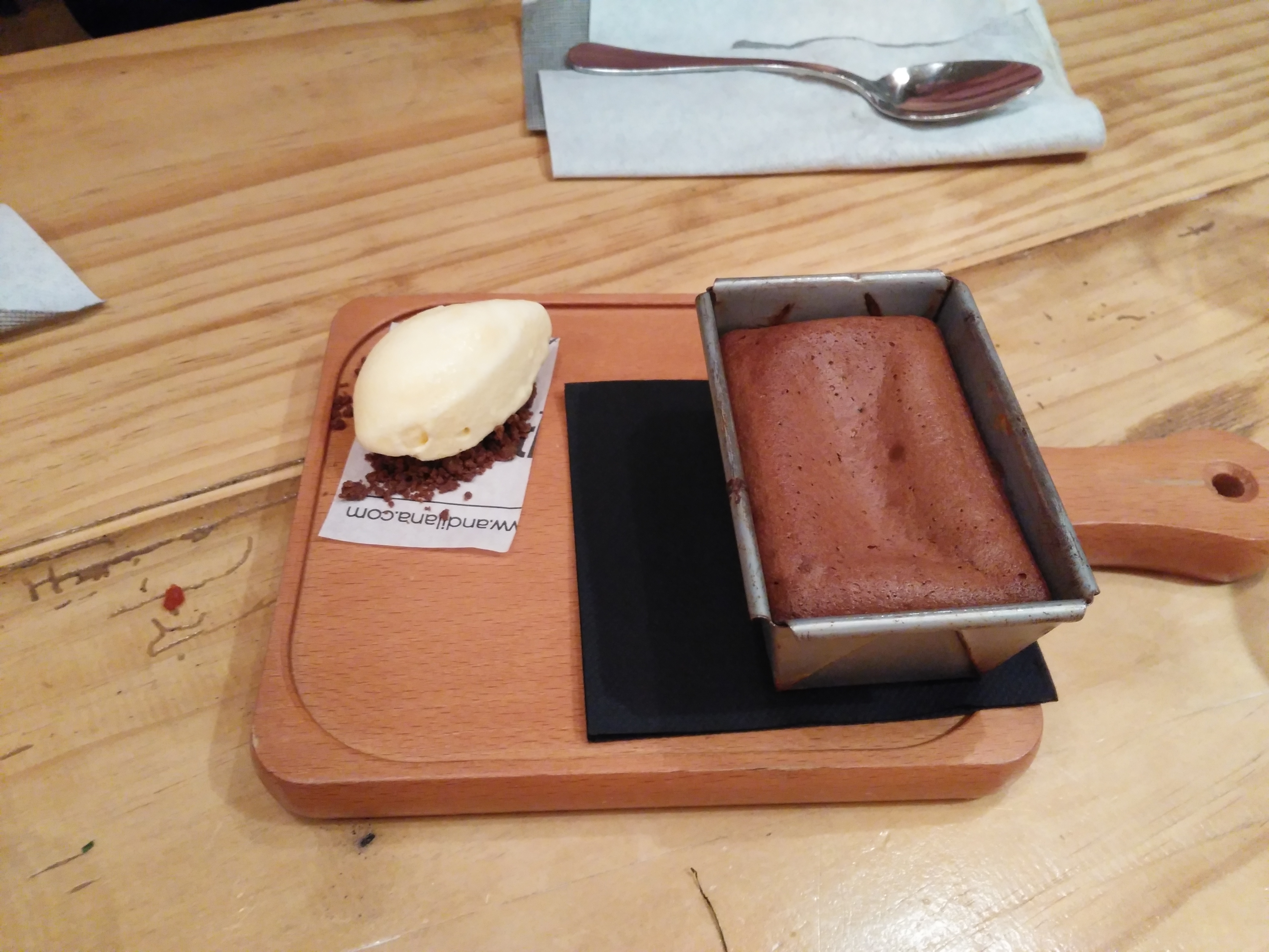 - Coulant de chocolate con crema helada de vainilla de Madagascar (4,95€) - Presentado dentro de un recipiente metálico que parecía de mini-plump cake y estaba realmente caliente, acompañado al lado de una quenelle de helado de vainilla sobre una tierra insípida que descansaba sobre un trozo de papel. Todo encima de una tabla de madera. Aparte del aspecto extraño de la presentación y de la mala pinta del coulant -demasiado crudo y desinflado-, tenía un desagradable sabor metálico. El helado tampoco es que me encantase. Un auténtico fiasco.