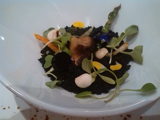 Para empezar otra vez pedimos el pintxo de concurso, una composición de verduritas baby, sobre una tierra comestible y debajo un parmentier, 2,5+iva.