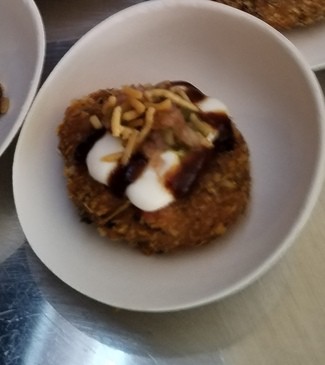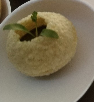 El menú comienza con algo que se llama Amuse Bouche, y que no me acuerdo para nada de su composición, si recuerdo que según explicaron se trata de un homenaje a la street food de la India, una especie de cuenco hecho con una pasta de ¿maiz?, que en su interior tiene una amalgama de diferentes productos típicos: patata, garbanzo y no recuerdo que mas cosas, le echan un caldito de tamarindo y lo comes de un bocado con la mano ,- pero rápido, de lo contrario se deshace -, en teoría, en la boca debes sentir como una explosión de sabores de la India. El mío debía estar sin pólvora, no ha explotado nada.