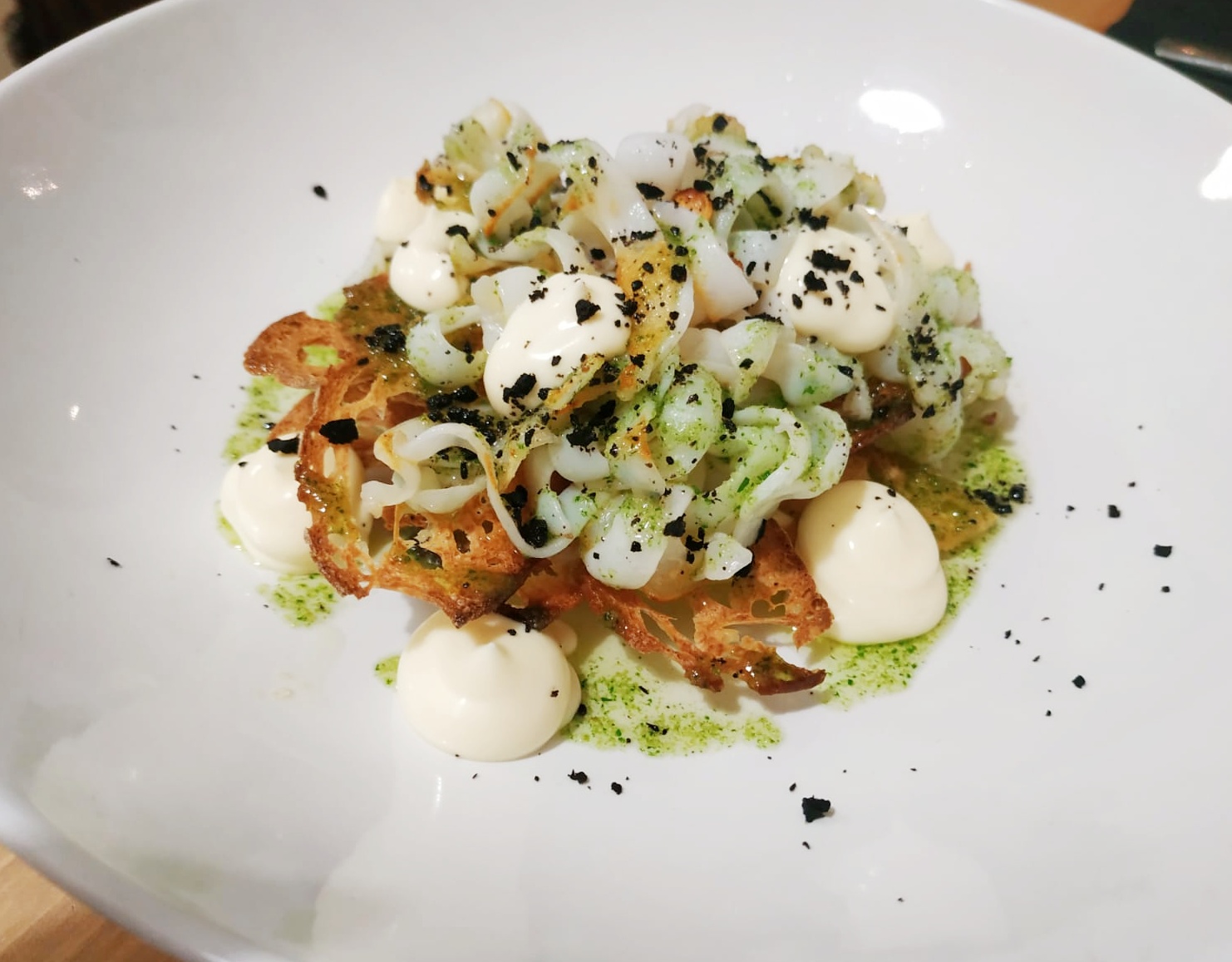 -Bocata de sepia con musa: En un plato amplio encontramos tres finas tostadas sobre las que descansan unos bien conseguidos tallarines de sepia y un aderezo de perejil, aceite y ajo. El plato lo rematan unas montañitas de mahonesa. El único “pero” que le pudimos poner fue quizá un leve exceso de aceite en el conjunto.