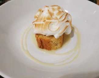 -Torta: Parte dulce de la velada iniciada por un plato con toques ácidos. Una torta casera dejada sobre una crema de limón y con merengue en su cumbre. Muy bueno.