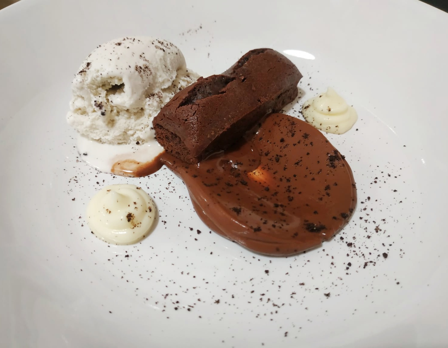 -Chocolate: De nuevo un brownie casero acompañada por chocolate con leche fundido y un espectacular helado de romero que ya nos cautivó en una de nuestras anteriores visitas.