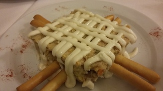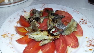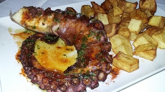 Algún plato muy bien, como fue la pata de pulpo a la plancha, no espera esa pataza y menos tan rica y tierna. Otros bien, como el caso de la ensaladilla rusa con esa "peculiar" presentación del que quiere jugar. El mismo tomate, con capellán a la brasa, con las rodajas ¡por fin! de un sabroso tomate maduro en su punto. Y los demás correctillos: Chipirones rebozados a los que a muchos no les quitaron la barqueta. Croquetas, las de bacalao caseras y el resto congeladas según nos reconoció el honesto camarero. La brocheta de secreto mejor que esa piruleta de solomillo más de orza que fresco y que luego la plancha no le hizo ningún bien. Y en cuanto al postre, dicen el par de golosos que el crepe de chocolate estaba bueno.