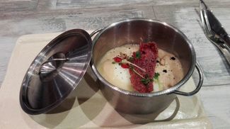 - Huevo a baja temperatura con patata confitada y hierbas salinas: plato rebosante de sabor, presentado en una cacerolita pequeña, pero que lo que buscan en un guiso con sabor y vaya si lo consiguen, tremendo el sabor que consiguen con este plato simplemente con huevo y patatas. Un único pero: plato contundente y que al llevar patata te puede llegar a llenar, no en mi caso, pero si en el de mi mujer. No pasa nada, ya me termino yo su plato.