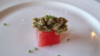 1. Sorbete sólido de sandía y Campari con hierbabuena y ortiguilla de mar. Fruto de una "marihuanada". Jeje... el tío le echa rollo. Dos tipos de frescura distintos conviviendo, el cubo de fruta dulce y el marino más exquisito. Me encantan las ortiguillas. Se podría decir que éste era el aperitivo de bienvenida.
