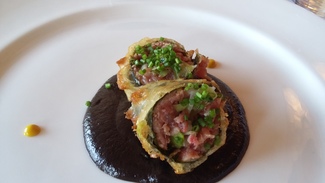 3. Sushi valenciano. Llega el primer guiso. Cobertura crujiente y sápido relleno de longaniza confitada, ajetes y habitas frescas. Muy destacable la crema que lo sujetaba pues la morcilla era de una delicadeza que no le pertenece de normal.