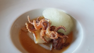 6. Chipirón con fondo de cebolla y espuma de pepino. Otra muestra más de cómo trabaja la cuchara este tío. Las patitas las hizo a la andaluza para que tuviera el crunch que dice él tanto nos gusta a los valencianos. ¡Jaja...! Muy bueno, incluía blanquet para sumar intensidad y la espuma de la verdura imprimiendo ya saben qué a estas alturas.