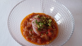 Sushi de longaniza con ajetes y habitas, sobre crema de morcilla de cebolla, tomate y tinta de calamar. Sobre el hermetismo nipón, surge un makizushi en el que el principal ingrediente es una sabrosísima longaniza local, macerada y potenciada con los ajetes y las habitas, sobre una base de crema fría de morcilla y tinta de calamar que obliga a rebañar el plato con pan.