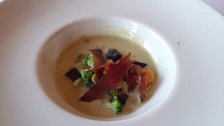 - Sopa de cebolla , un fondo de caldo dashi, con un ravioli de cebolla caramelizada, parmesano y una yema criogenizada. SIMPLEMENTE GRACIAS, el primer plato que tome de Luiser en La Mozaira hace años, y el que siempre que pienso en su cocina, este plato esta en mi mente.