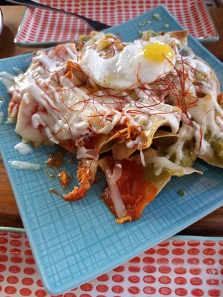 - Chilaquiles rojos con pollo y queso fundido (10€): Plato que consiste en unos totopos cocidos en salsa de chile y caldo, presentados en esa misma salsa, pollo deshebrado y queso. Sabroso y contundente platillo. Muy rico.