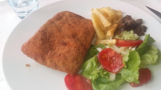 Yo que soy de los de allí donde fueres, hicieres lo que vieres me pedí el famoso cachopo, con sus patatinas, ensalada y unos pocos hongos de acompañamiento, muy sabroso y de buen tamaño.