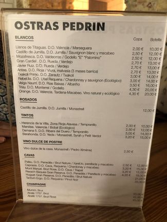 Como ya habrá adivinado el sufrido y pícaro lector, la oferta está centrada en las ostras. En estos momentos tiene de 4 clases y cito por precio, de menor a mayor: valenciana, asturiana, Guillardeau y “Ostra del Sol”.