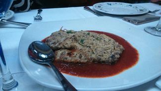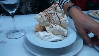 Escogí Crema de puerro y hongos con virutas de foie, también correcto, sabroso, en general la gente contenta, de segundo me pedí unos chipirones encebollados, abundante plato, pero a mi no me supieron a nada, sin sabor, la gente en general contenta con sus segundos, los del bacalao a la vizcaína, los que mas, yo desde luego no.
