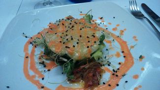 Mantelería correcta y vajilla en la misma línea, empezamos con tres entradas para compartir.