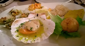 Me sedujo probar el bacalao mantecado, algo muy muy veneciano, es como una pasta-crema hecha a base de bacalao desalado cocido en leche, la leche sobrante, anchoas, perejil y ajo, al que suelen acompañar con algo tan de allá como la polenta, y que se consume frío. Los antipasti, muy buenos, como siempre cuando son marineros, en este caso llevaban además de los típicos marinados, unas zamburiñas a la plancha y un buen buñuelo de bacalao. Los moeche, muy valorados por los venecianos, resultaron ser algo destacable y delicioso, se trata de pequeños cangrejos de mar capturados en el momento en el que mudan el caparazón, de modo que se comen enteros, rebozados y fritos, qué locura. Cómo no, algo de pasta, taglioni en este caso, con granseola (araña de mar desmigada), y de nuevo al más rabioso dente, muy, muy buenos, pedían picante a gritos, pero por aquí no se estila. El rape, cómo no también, fresco y demasiado hecho, dos constantes en Italia. Y el tiramisú, feote, pero muy rico (no sé si incluso decir que mejor que en Algiubagio, Joaquín jeje).