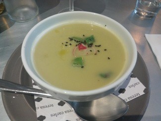 Pero hablemos de las cosas positivas: la comida vale mucho la pena porque no solamente es sana sino que está bien presentada y con variedad para escoger (2 entrantes, 5 primeros y 3 postres) aunque eso sí, es la misma toda la semana. Para empezar los dos tomamos una crema fría de espárragos verdes con rabanitos. Muy suave y sabrosa a la vez, la textura también de notable. Como principal yo me decidí por unos pastelitos de berenjena y ajos tiernos con velouté de puerros. De forma circular, la cantidad era más que correcta y muy ricos de sabor con una salsita verde por encima. Mi pareja tomó arroz integral con setas. También buena cantidad, no me gustó tanto (no estoy acostumbrado al integral) aunque las setas lo mejoraban.