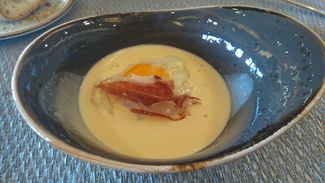 Huevo a baja temperatura, puré rico de patata y una crema de jamón espectacular, la combinación de estos productos no falla nunca, es mas, yo diría que incluso haciéndolos mal, estarían buenos, no es el caso estaban muy bien ejecutados .