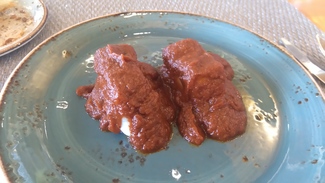 Bacalao a la vizcaína , dos bonitos lingotes de bacalao , muy bien desalados , con un confitado perfecto , las lascas trasparentes , sabroso y perfectamente acompañados de una salsa a la vizcaína , que aunque de apariencia espesa , estaba suave y muy agradable , vamos para comer a cucharadas .