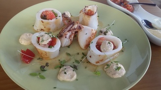 Calamar fresco, entero, cuyas rodajas rellenan con el tomate, responsable de restarle temperatura. La mezcla con la mayonesa lo hacía muy rico, pero ya digo que le faltaba calor a este plato.