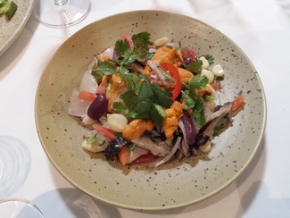 De entrantes: un piqueo de sarza de mar, con erizos y lapas en su sarza de cebolla, tomate y rocoto. Celadores de camarón al limón y su coral. Sarza y papas nativas. Y un cebiche clásico.