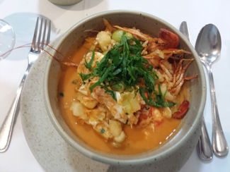 De segundos: Chupe de camarones y Pulpo a la brasa con jugo de