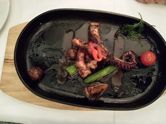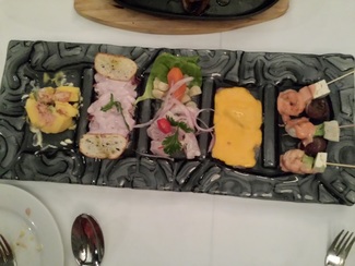 Un pulpo croc a la brasa con sus papas variadas y maiz y un cebiche especial de corvina, con camarones, acompañados por un Chardonnay chileno, Sibaris gran reserva.