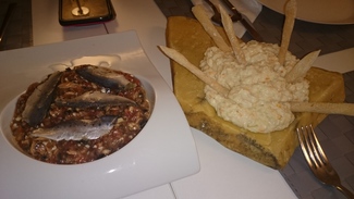 Moje manchego, tomate, olivas, comino y sardinas, muy sabroso, pelin pasado de sal, nada que el vino no arregle.