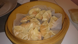 Dumping de gambas, col china y papada, en la típica vaporera asiática, sabrosos, le faltaba un poco de cocción a la parte que no llevaba relleno, con lo que fue un daño asumible.