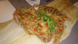 Pañuelos, pasta wanton rellena de col, magret de pato y foie gras, frita y acompañada de una salsa wok japonesa, muy rico.