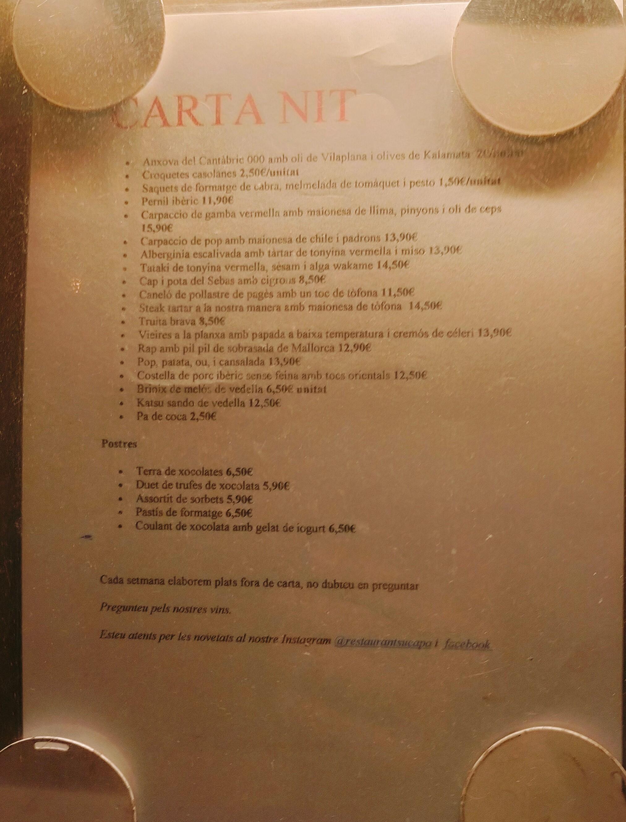Sopar per a dos. Ens van oferir mitja dotzena de suggeriments fora de carta. Plats per compartir.