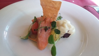 El siguiente plato fue un salmón marinado con tomate, berenjena y espuma templada de apio. Bien el salmón, con unos cherry escaldados, el aporte de la berenjena a la llama y una espuma de apio muy contenida ya que la frescura del apio es invasiva. Un plato fresco.