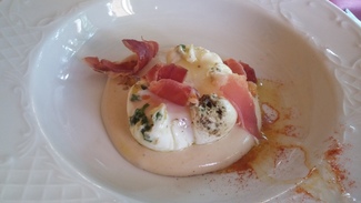 A continuación, huevo, jamón y hongos. Una crema de setas de sabor suave con el huevo poché y el jamón encima. Una combinación nada nueva pero de resultado siempre ganador, difícil no gustar. Quizá con el jamón crujiente mejor, pero rico plato en definitiva.
