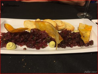 ─ Tartar de atún con mayonesa de Wasabi (1 x 15€). Muy bueno. Lo primero que debo decir es que la ración me parece muy generosa y que quizás también deberían ofrecerla por medias, ya que para dos personas es mucho, si se quieren compartir varias cosas. Por lo demás es un atún que me pareció muy bueno, marinado en una salsa de soja y servido posteriormente con unas rebanadas de pan tostado y una mayonesa de Wasavi. La contundencia que da la soja queda diluida por el balsámico que da la mahonesa haciendo una combinación verdaderamente buena. Mucho cuidado con la mezcla de Wasavi pues la cantidad que sirven es importante y si lo mezclas todo puede quedar demasiado picante.