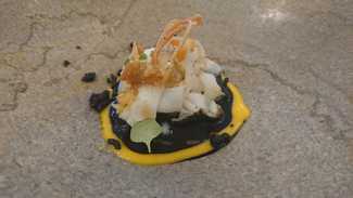 . calamar de Guadañera, cremoso de tinta, crujiente ibérico y chimichurri: calamar a modo de tallarines pero que resulta bastante insulso