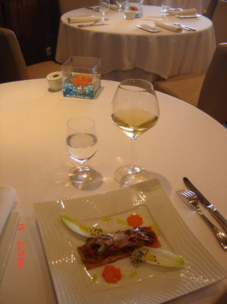 Nosotros optamos por un riesling spätlese trocken de la zona de Rheingau (no recuerdo el nombre exacto) que petroleó de principio a fin (sobretodo al principio). No me gustó particulamente dado a las marcadas notas de hidrocarburos que daba y que, como comento, no llegaron a desaparecer. Copas Riedel serie Vinum. El sommelier atento aunque poco dado a explicaciones.