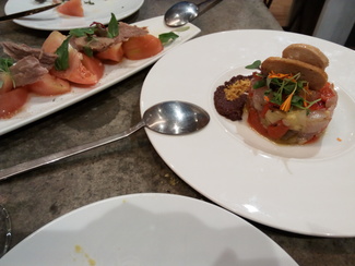 Empezamos con los entrantes: un hummus bastante original (color muy amarillo) con tostadas, semillas de amapola y ensalada de bolsa que no pintaba nada. Presentación buena. De sabor no destacaba. Luego una ventresca de atún con tomate, también con ensalada de bolsa (!?). Correcta sin más (producto muy normalillo). El otro fue una escalivada de verduras con tomate, ensalada y olivada. Algo mejor pero sin emocionar. Los últimos platos rondaban los 7 euros.