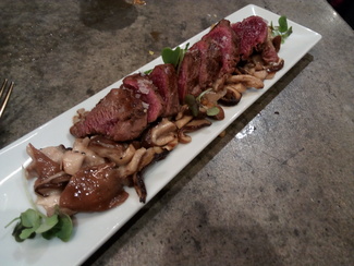 Como platos más contundentes yo pedí el canelón de calabacín y berenjena con langostinos y cítricos (9.90 eur). Gran presentación pero muy discreto. Estaba rico pero nada digno de recordar. Demasiados adornos (ver foto) par mi gusto. El colega tomó solomillo (100 gr) con foie (13.50 eur). Luego nos pedimos otro cada uno: el mío con setas que la verdad estaba realmente bueno: al punto de cocción, bien cortado, las setas de nivel... (12.50 eur)