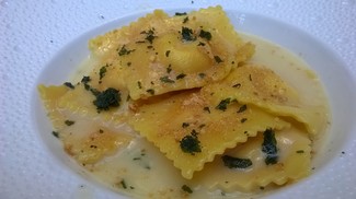 Plato principal de Ravioli rellenos de calabaza (Angnelotti), con mantequilla y salvia. Bocatto di cardinale. Buena temperatura, tamaño y textura.