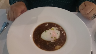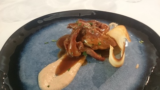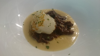 Huevo asado a 68º, estofado de manitas y patata tartufo, siempre que hay un huevo y patata, hay algo grande en el plato, si además le ponen el suave estofado de manitas, le aporta un poco en untuosidad, con lo que haces un plato grande, excelso.