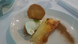 Paletilla de cordero asada a fuego lento, ajo blanco-negro y jugo de su cocción , con un chip de boniato , quizás el plato que menos me sedujo , últimamente las carnes , no se , no me llaman demasiado , pero se utiliza la misma exitosa forma de trabajar , buen producto , sencilla , pero sabrosa elaboración y buena sinergia entre los productos que forman el plato .
