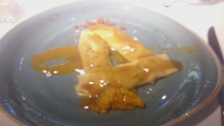 El primer entrante fue foie caramelizado, mermelada de higos y crujiente de pistachos, dos pequeños medallones por persona, bien ejecutados, original el crujiente de pistachos y sabrosa la compota de higos.
