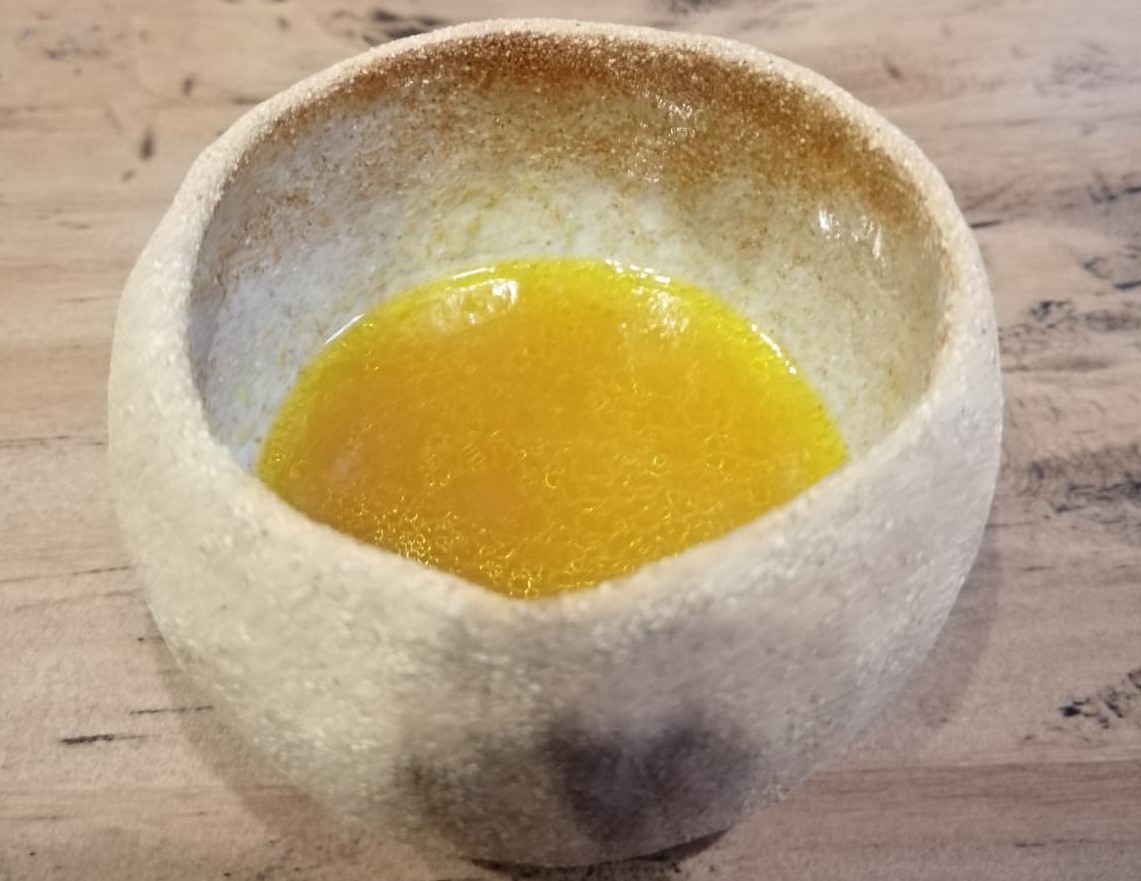 El menú arranca con dos aperitivos que ya suponen una verdadera declaración de intenciones. La mandarina y botarga por un lado y el carrueco por el otro nos sorprenden ya de salida por todos esos rasgos que citaba en párrafos anteriores: el juego de texturas (la mandarina como liofilizada, la botarga rallada o el carrueco líquido en contraposición a la presentación clásica a modo de puré), el contraste entre sabores singulares (ácido-salado), etcétera.