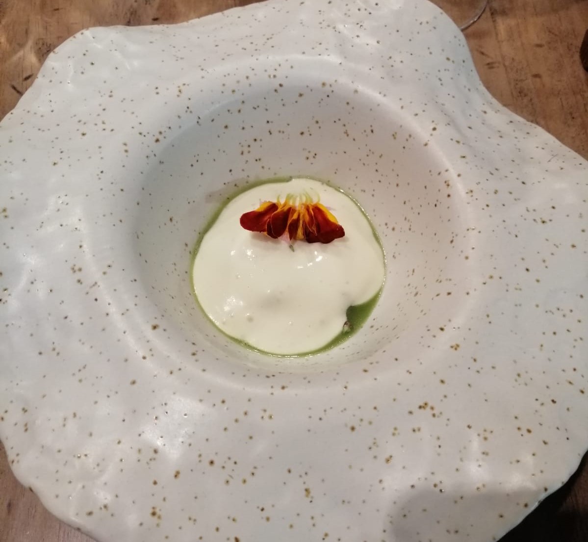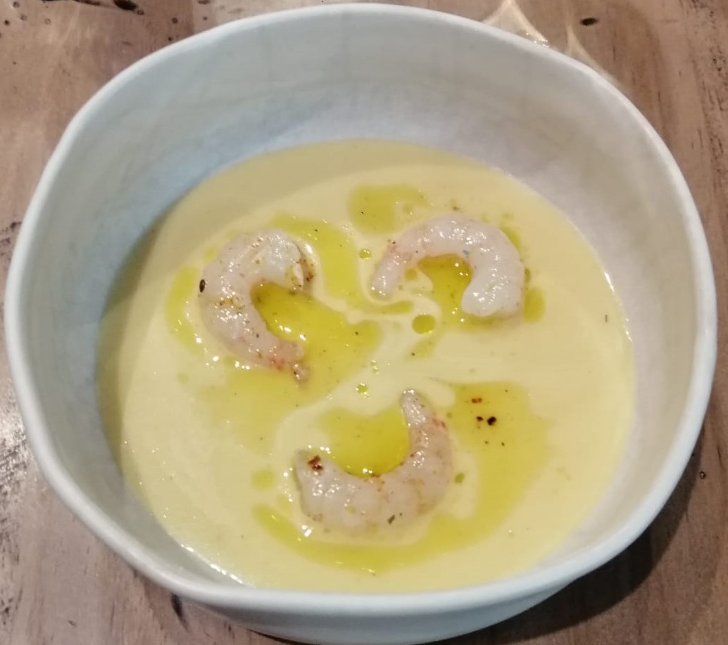 Ajo blanco de almendra y coco con granizado de piña y albahaca, muy refrescante y sabroso ….